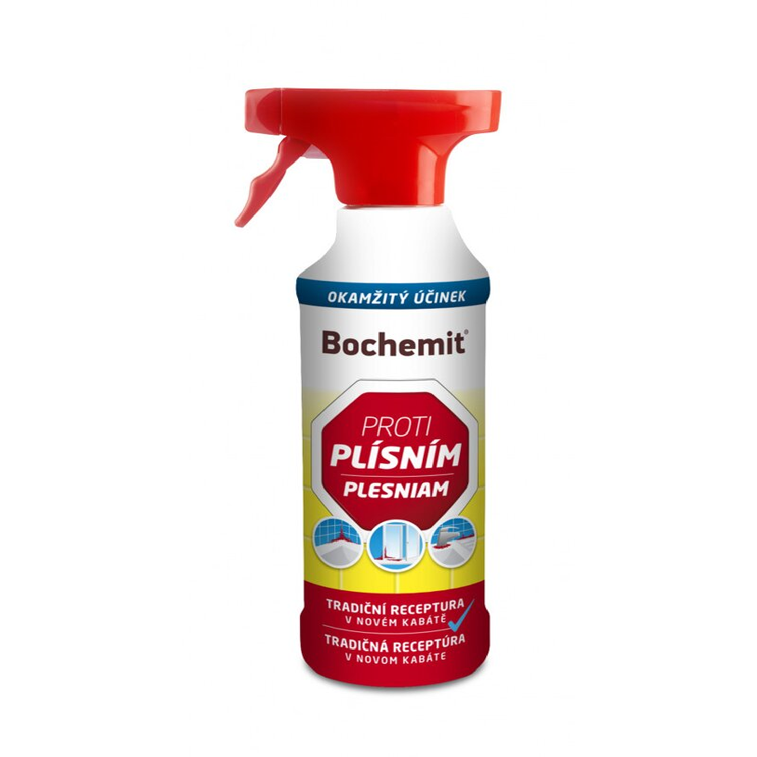 Bochemit proti plísním je kapalný přípravek ve spreji určený k odstranění plísní, hub, řas, lišejníků a kvasinek s okamžitým viditelným efektem a dezinfekčními účinky. Vhodný také pro rychlé a snadné oživení a zesvětlení zašlého dřeva a dřevěných prvků. Lze používat na omítky, zdivo, kámen, mramor, žulu, přírodní dřevo, keramiku, obkládačky, sklokeramiku, nepoškozený smalt, sklo a silikon. Používá se k likvidaci plísní v koupelnách (kolem van, umyvadel), v kuchyních (kolem kuchyňské linky), v obytných prostorách (kolem oken), v prádelnách, sklepech, garážích, přístřešcích, hospodářských budovách, v bazénech, saunách, v komunální hygieně , skladovacích prostorách a pod. Směs je účinná proti mikroskopickým vláknitým houbám, řasám, lišejníkům, kvasinkám a bakteriím. Má fungicidní i baktericidní účinky.
