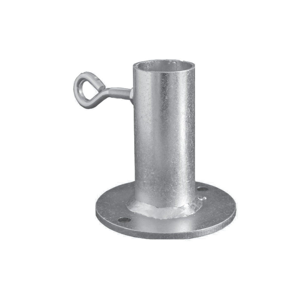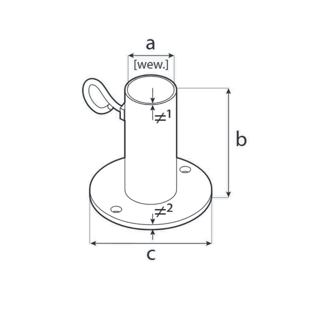 Patka sloupku se šroubem „s uchem” M8, určená k montáži svislých prvků s kruhovým průřezem (např. tyče slunečníku) na betonu.