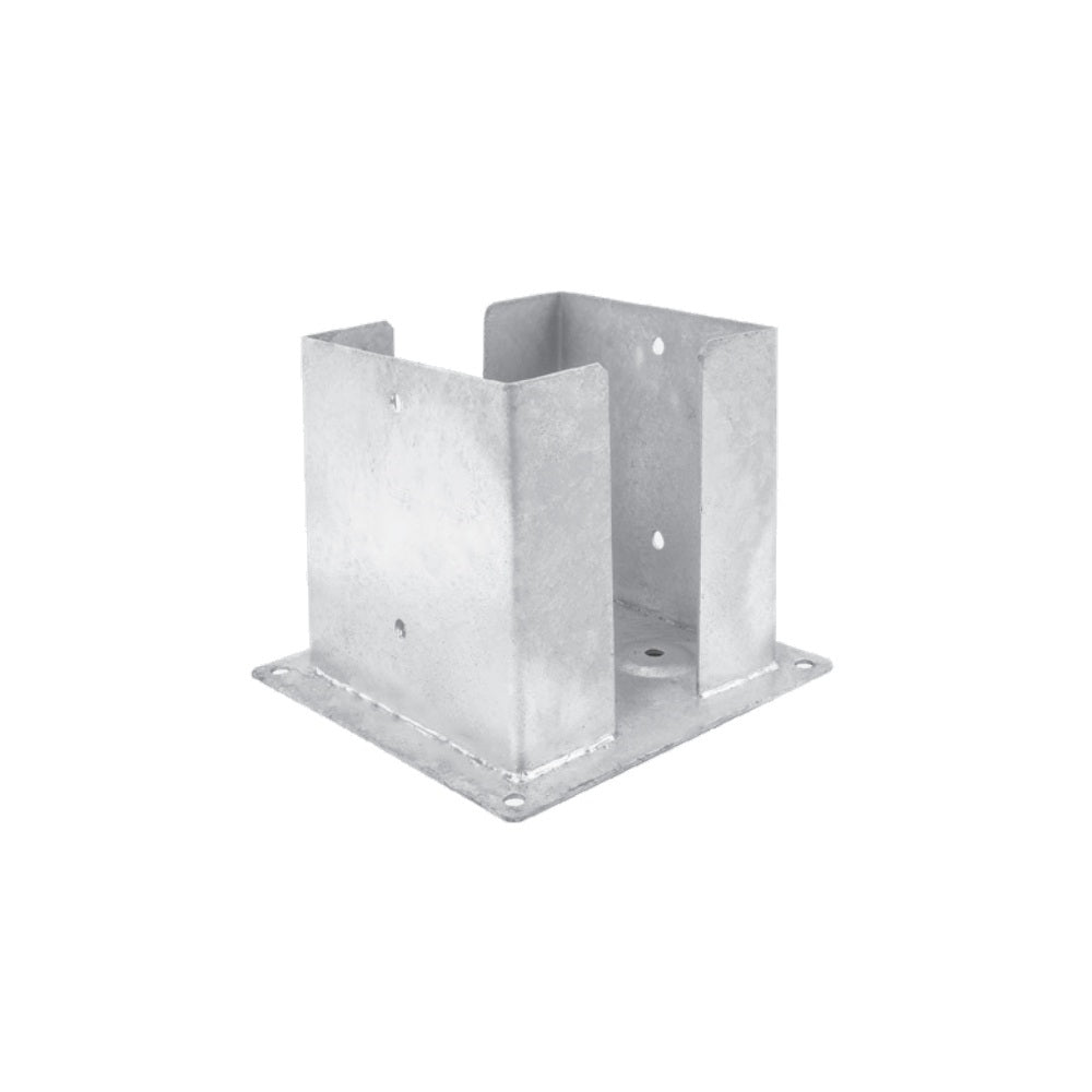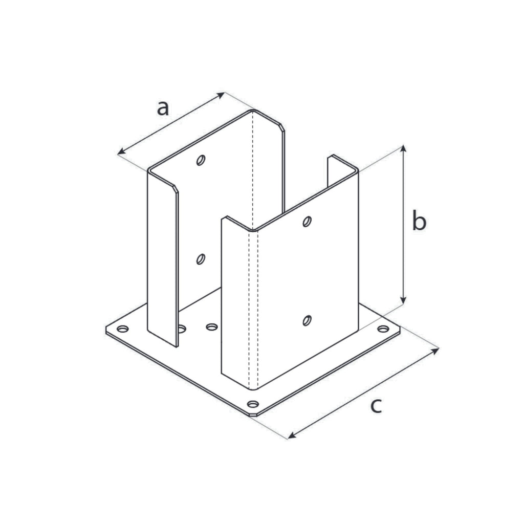 Patka pro montáž dřevěných sloupů se čtvercovým průřezem na betonu. Montážní otvory zvenčí patky zaručují stabilitu konstrukce, a hluboce vyříznuté boky umožňují lépe exponovat dřevo.