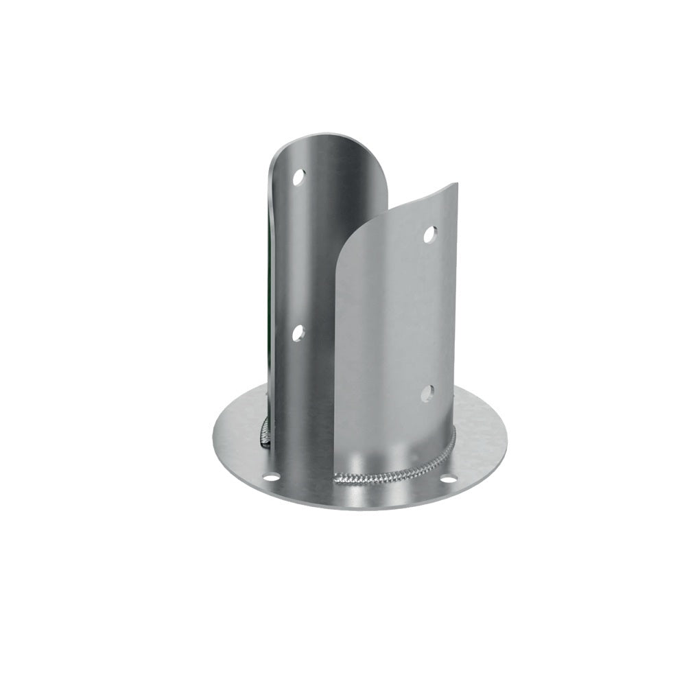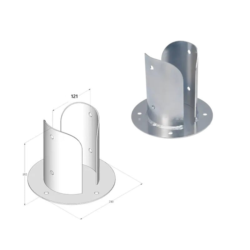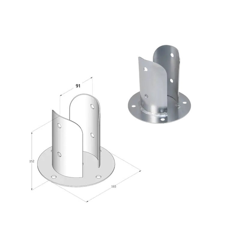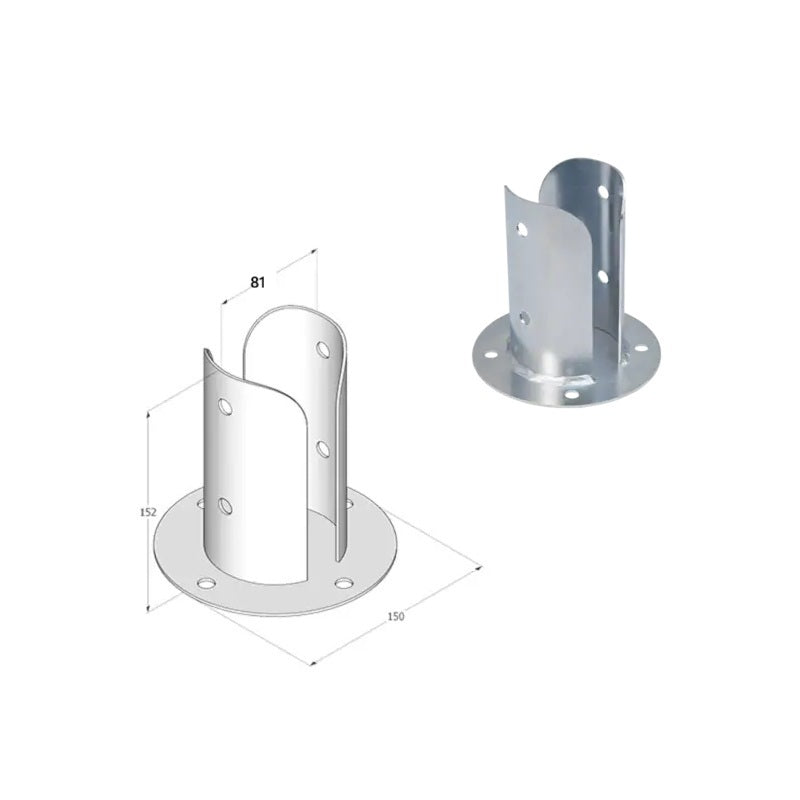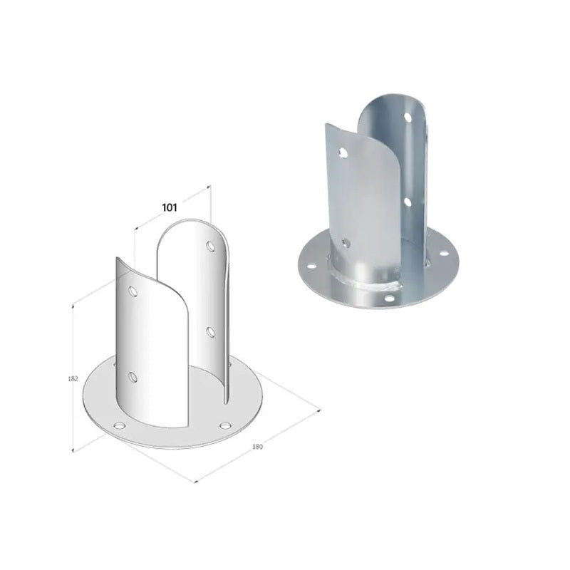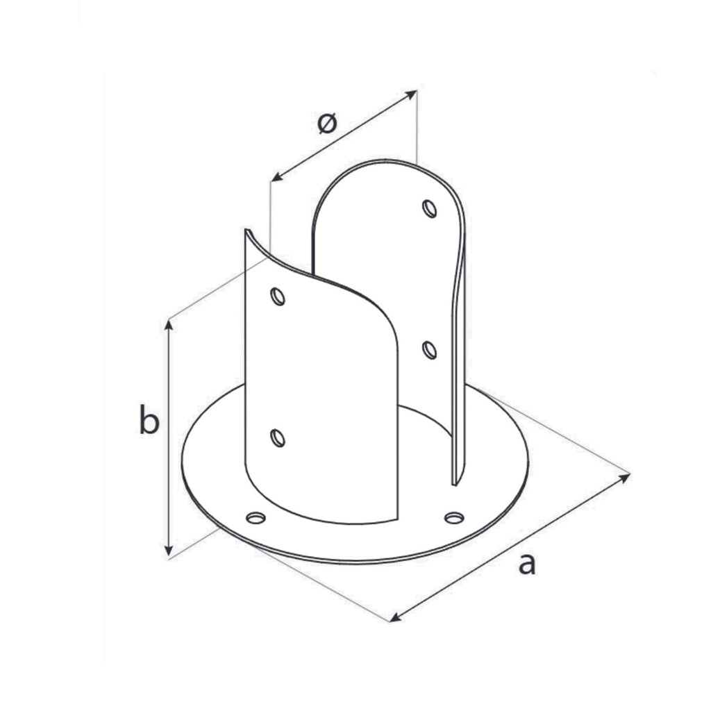 Patka pro montáž dřevěných sloupů s kruhovým průřezem na betonu. Montážní otvory zvenčí patky zaručují stabilitu konstrukce, a hluboce vyřezané boky umožňují lépe exponovat dřevo.