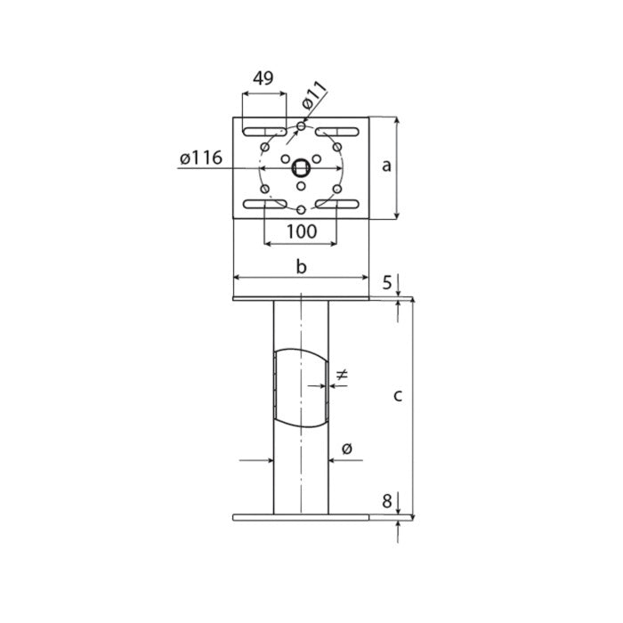 Prodloužení patky PWM a PWF uzavřené obdélníkovou deskou s otvory umožnujícími připevnění a nastavení příslušenství. Zajišťuje zvýšení funkcionality základny.
