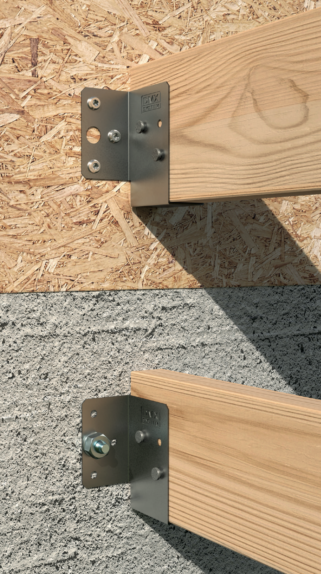 K upevnění se doporučuje použít vroubkované hřebíky ANCHOR Ø4 nebo ANW, případně šrouby ANCHOR Ø5 s hlavou TX-20, a podle podkladu také šrouby do dřeva Ø10, šrouby M10 nebo kotvy do betonu M10, aby bylo dosaženo maximální pevnosti a bezpečnosti spoje.
