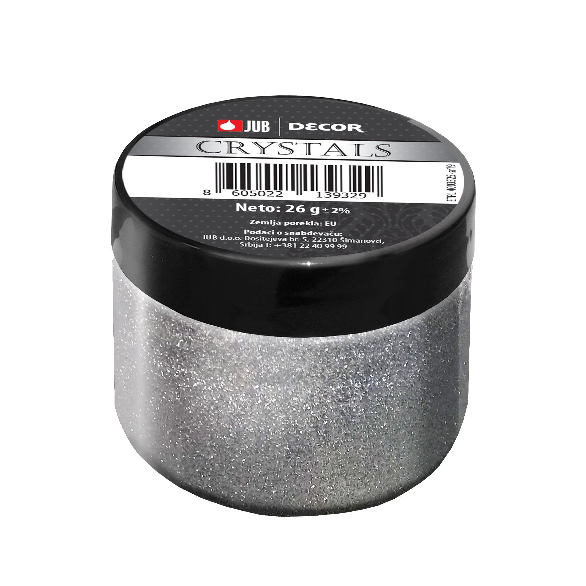 JUB DECOR Crystals stříbrné dekorativní třpytky do barvy v gelu DECOR Crystal k dosažení třpytivého a glamurózního efektu na stěnovém povrchu.