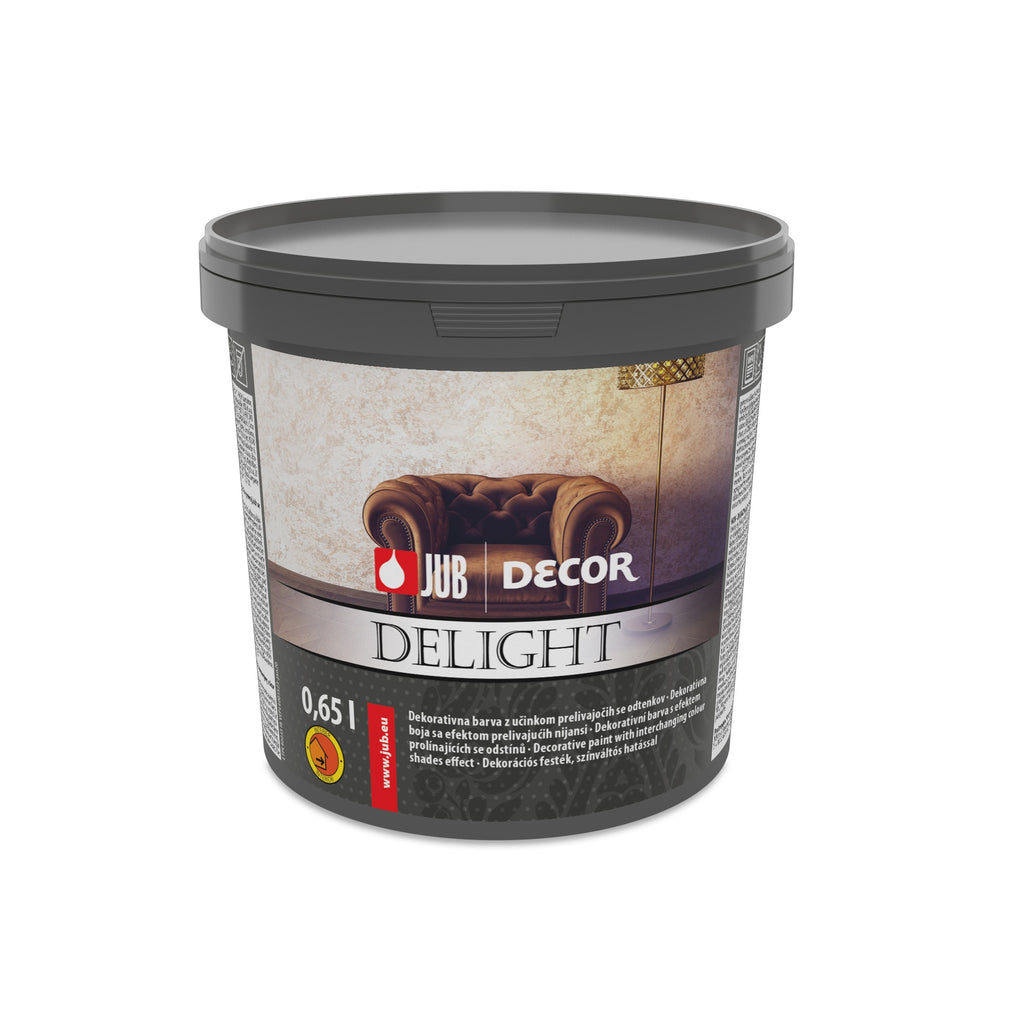 JUB DECOR Delight dekorativní barva s přelévajícím efektem je sofistikovaná, reprezentativní dekorativní povrchová úprava pro interiérové použití. Vyznačuje se perleťovým efektem, velice snadno se nanáší a má dobrou paropropustnost. Díky svým jedinečným vlastnostem lze DECOR Delight použít v elegantním prostředí klasického i neoklasicistního stylu, v moderních prostorech, veřejných objektech i v soukromých budovách. Je nehořlavý a po 3 týdnech od aplikace je odolný vůči oděru za mokra („omyvatelný“).