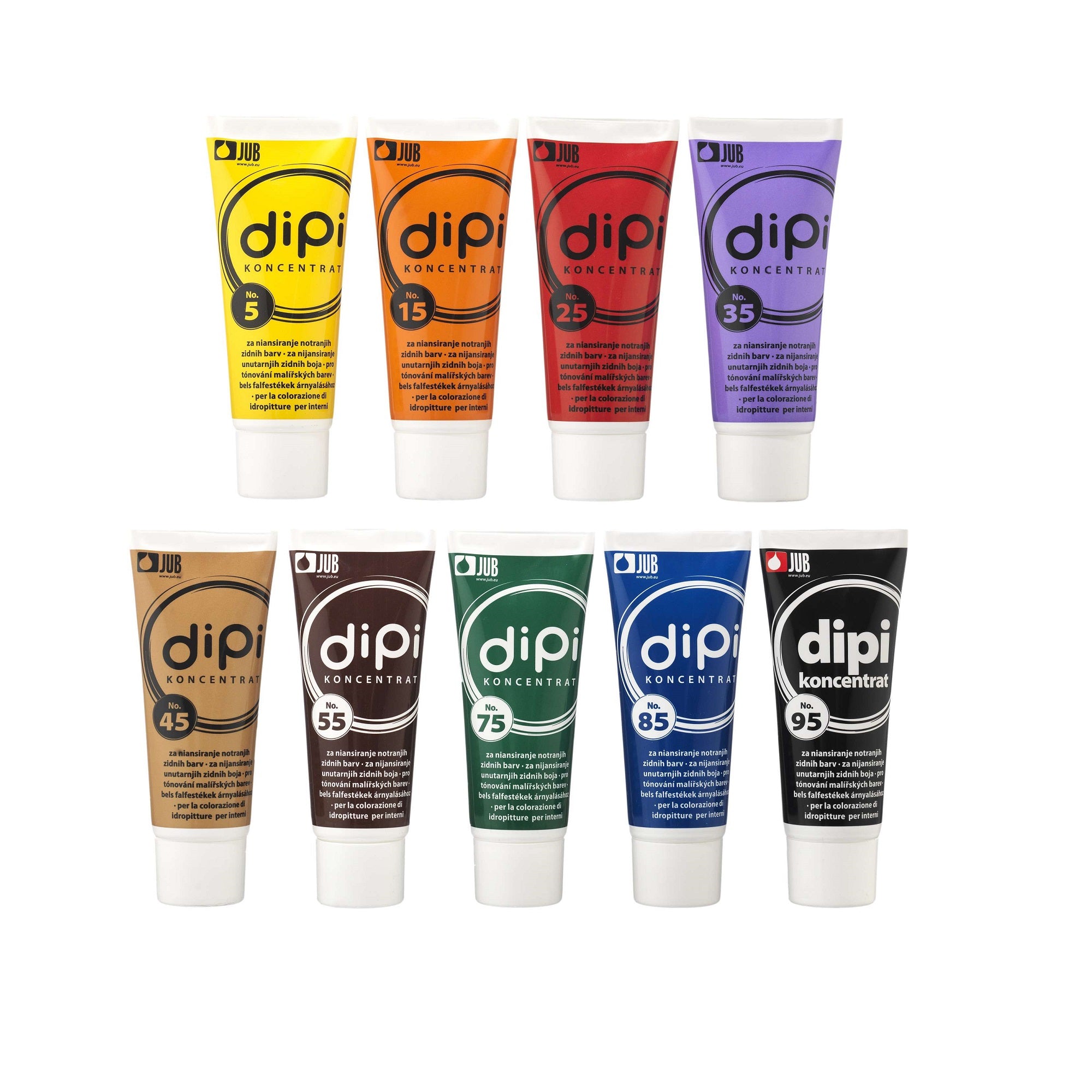 JUB DIPI Koncentrat tónovací pigment do interiérových barev je pastovitý prostředek pro tónování disperzních malířských barev na pastelové odstíny. Je vyroben z kvalitních anorganických a organických pigmentů, je k dispozici ve 9 barevných odstínech.