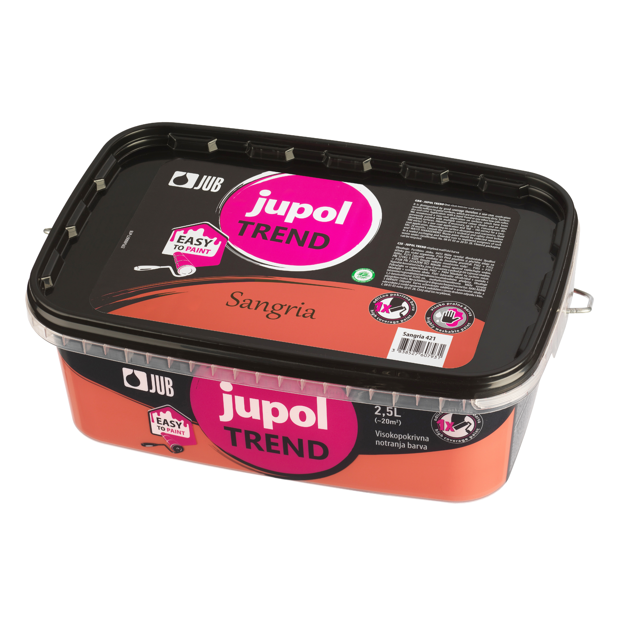 JUB JUPOL Trend interiérová omyvatelná malířská barva na zeď je interiérová malířská barva, šetrná k lidskému zdraví, vyrobená na základě vodní disperze moderních polymerních pojiv. Je určena zejména pro rychlé obnovovací nátěry stěn a stropů v obytných, kancelářských a obchodních objektech, galeriích, v prostorech, kde probíhají kongresové, propagační a podobné akce, ve školách, školkách, hotelech, nemocnicích a jiných zdravotnických zařízeních, domovech pro seniory apod. Vhodným podkladem mohou být různé druhy starých disperzních nátěrů, které dobře drží na podkladu a nelze je snadno vodou rozmočit, při prvním natírání také jemné omítky všech druhů, povrchy vyrovnané různými vyrovnávacími hmotami, reliéfní papírové nebo sklotextilní tapety, ale i sádrokartonové a vláknocementové desky, dřevotřísky, neomítnutý beton a pod.