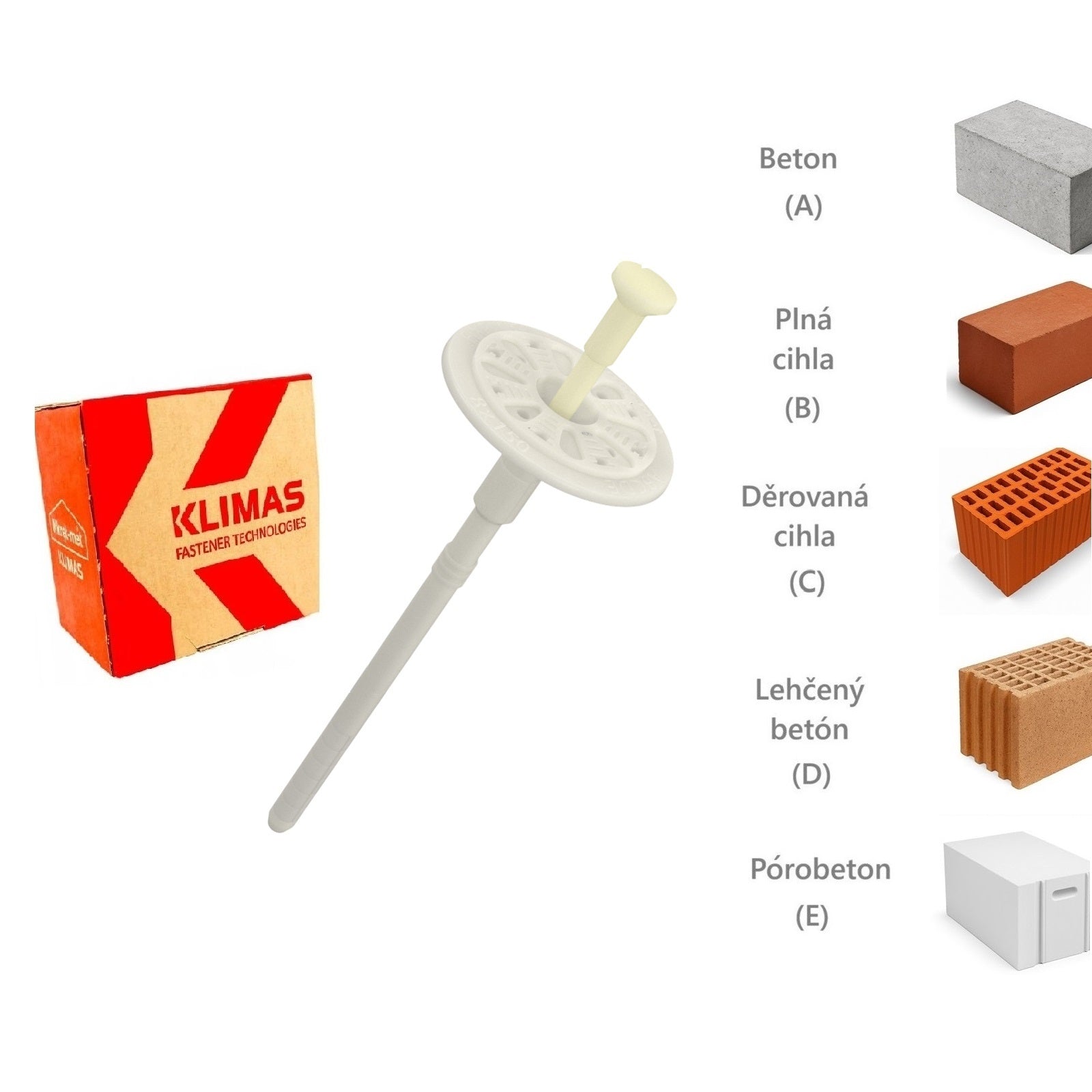 KLIMAS Wkret-met FIXPLUG Talířová hmoždinka s plastovým trnem Ø10 mm je plastová univerzální fasádní talířová hmoždinka zatloukací o průměru 10 mm s předmontovaným plastovým trnem vyrobená z polyethylenu, přičemž trn je z polyamidu vyztuženého skelným vláknem, což zvyšuje jeho pevnost. Teleskopický dřík zajišťuje bezproblémové zapuštění talířku pod povrch izolantu a eliminuje praskání trnů.