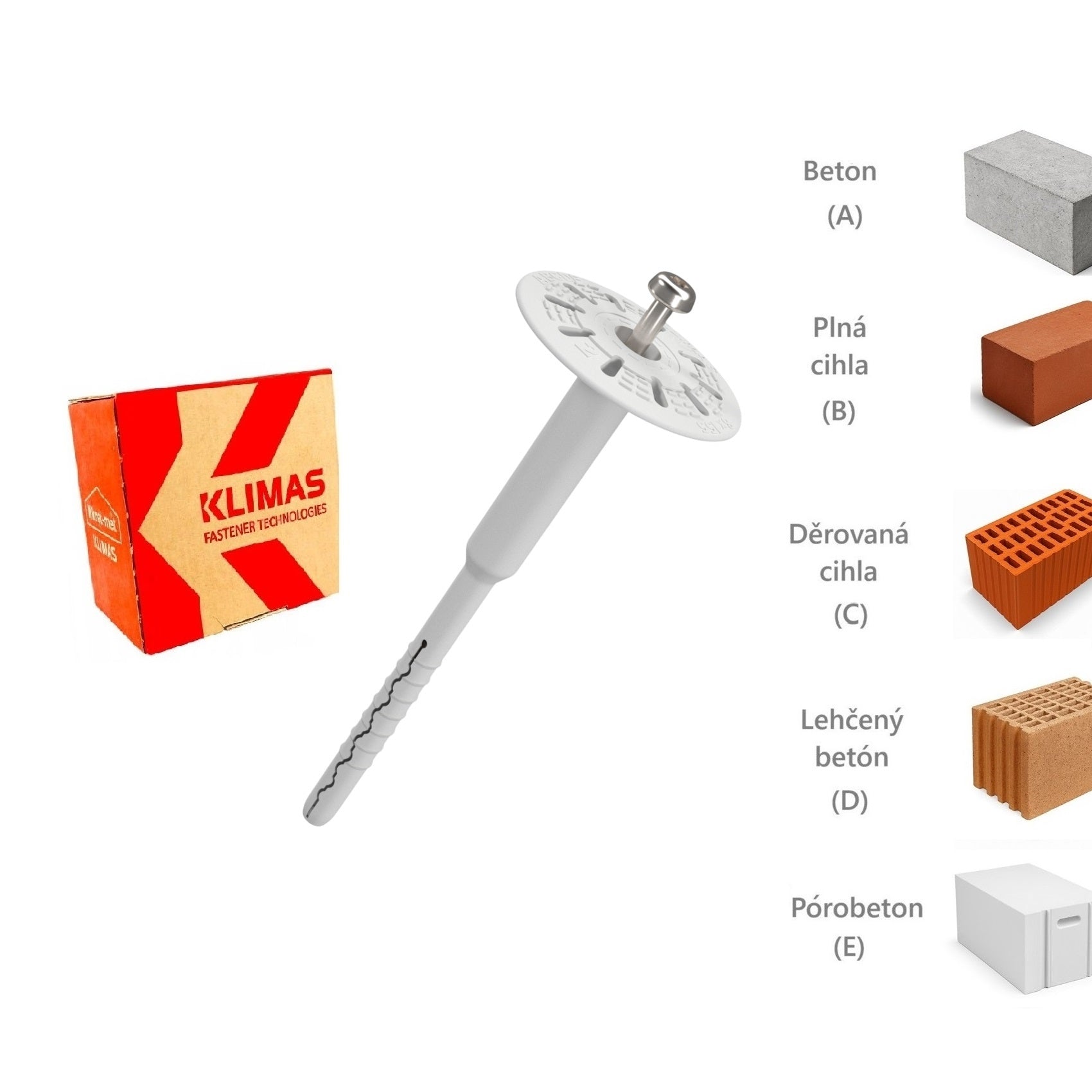 KLIMAS Wkret-met ThermoDrive-V2 Talířová hmoždinka s kovovým šroubem Ø8 mm je plastová univerzální fasádní talířová hmoždinka šroubovací o průměru 8 mm s předmontovaným kovovým šroubem. Je určena pro mechanické kotvení tepelně izolačních fasádních desek z minerální vlny, expandovaného polystyrenu (EPS) a tepelně izolačních desek z extrudovaného polystyrenu - styroduru (XPS) v rámci kontaktního zateplovacího systému ETICS.