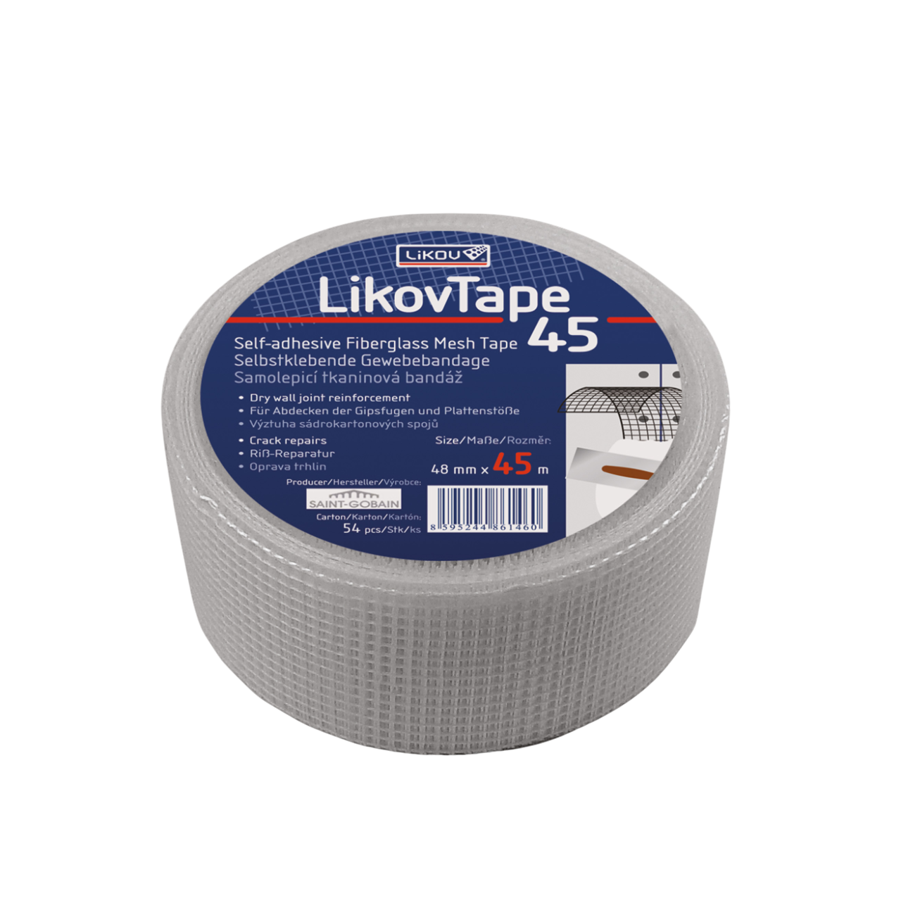 LIKOV LikovTape samolepicí tkaninová bandáž je určena k vyztužení plochých spojů sádrokartonových desek. Vyrobena je ze sklovláknité tkaniny, která zajišťuje pevnost a odolnost spoje. Díky samolepící schopnosti je její aplikace jednoduchá a rychlá. Bandáž zaručuje pevný a tenký spoj, eliminuje prach, bublinky a další nedokonalosti na spoji desek, čímž přispívá k dlouhé životnosti konstrukce. Bandáž má šířku 48 mm a je bílé barvy.