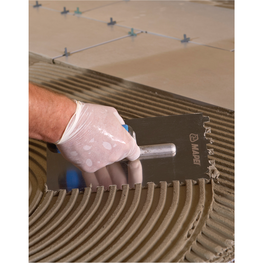 Pro zajištění dokonalé přídržnosti k podkladu naneste nejprve tenkou vrstvu lepidla Adesilex P7 pomocí hladké strany zubové stěrky. Ihned poté naneste potřebnou tloušťku lepidla vhodnou zubovou stěrkou, v závislosti na druhu a formátu obkladového prvku. Způsob instalace obkladových prvků musí zajistit požadovaný stupeň pokrytí podkladu lepidlem. Výběr zubové stěrky závisí na formátu obkladu a rovinatosti podkladu.