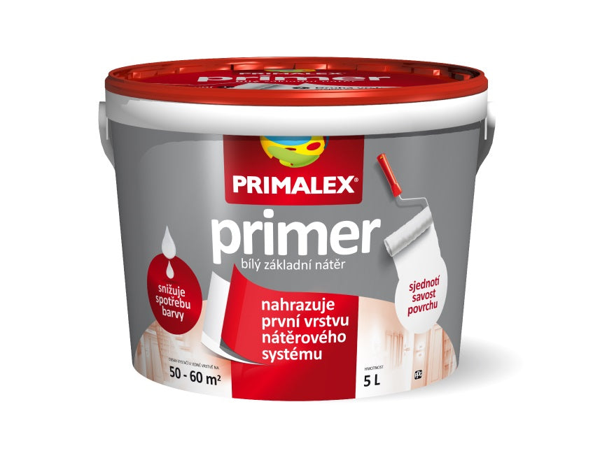 PRIMALEX primer bíla základní interiérová barva je bílá malířská základní barva na zeď vhodná pro přípravu podkladů v interiéru. Sjednocuje savost povrchu a zpevňuje natíraný podklad, čímž zvyšuje komfort malování a zároveň snižuje spotřebu barvy u finálního nátěru. Díky svým vlastnostem je jako základní nátěr vhodný pod kvalitní nátěry s vysokou otěruvzdorností za sucha a jakékoliv nátěry oděruvzdorné za mokra.